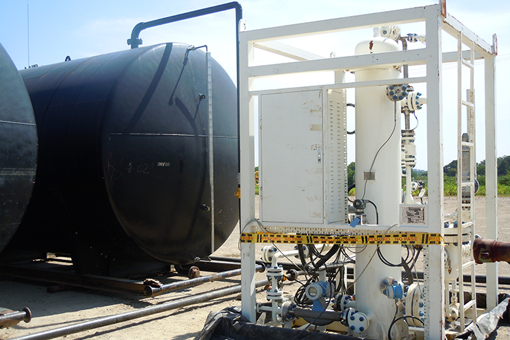 低产测试装置是小型、气液两相分离式油井测量装置,气液两相流经装置入口,而后进入气液旋流分离器,实现气液分离;